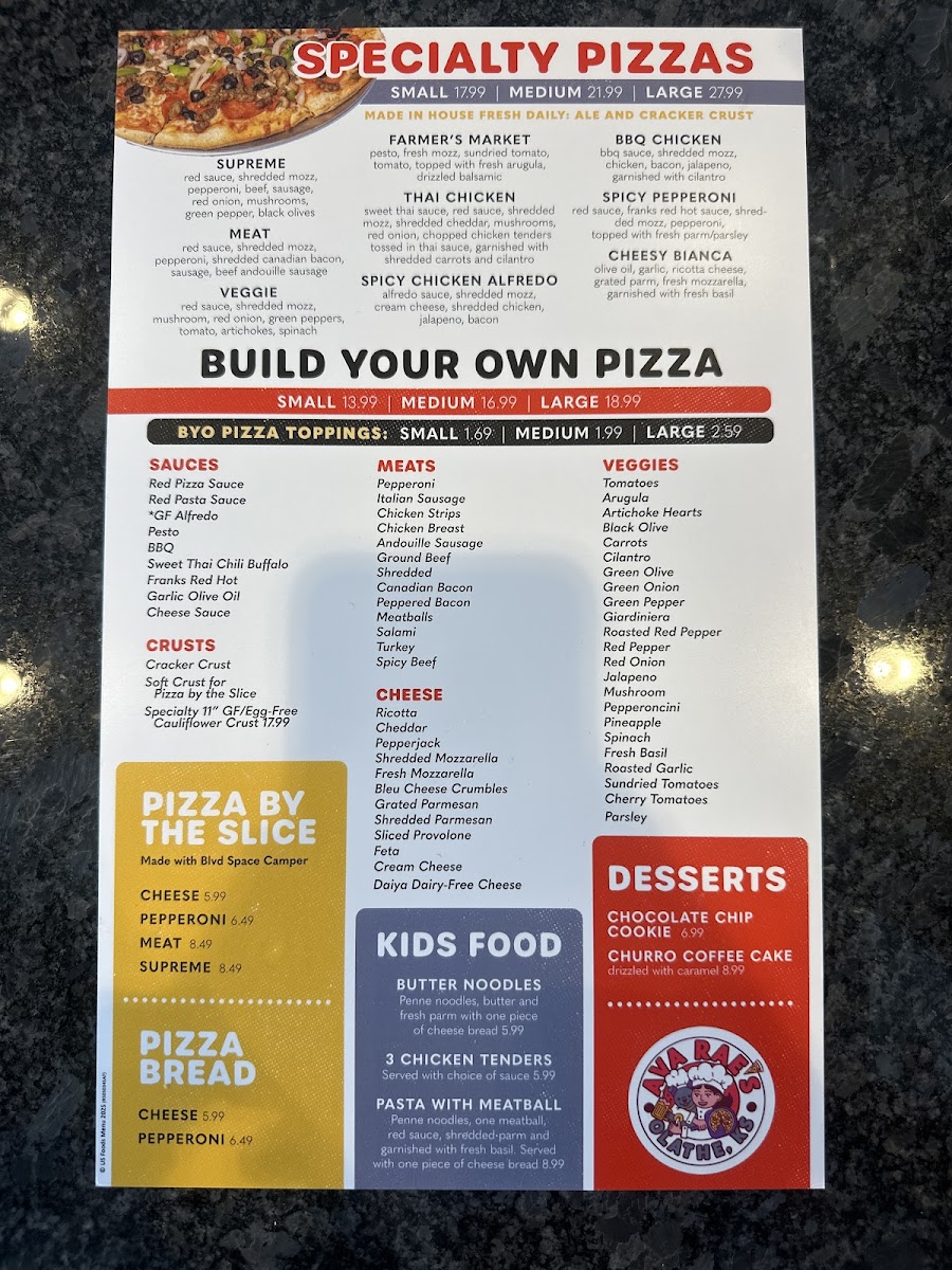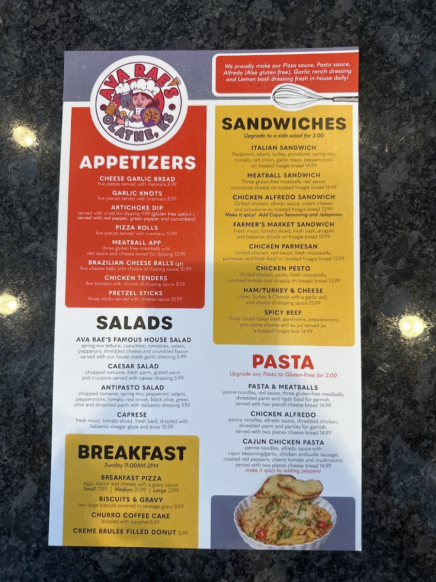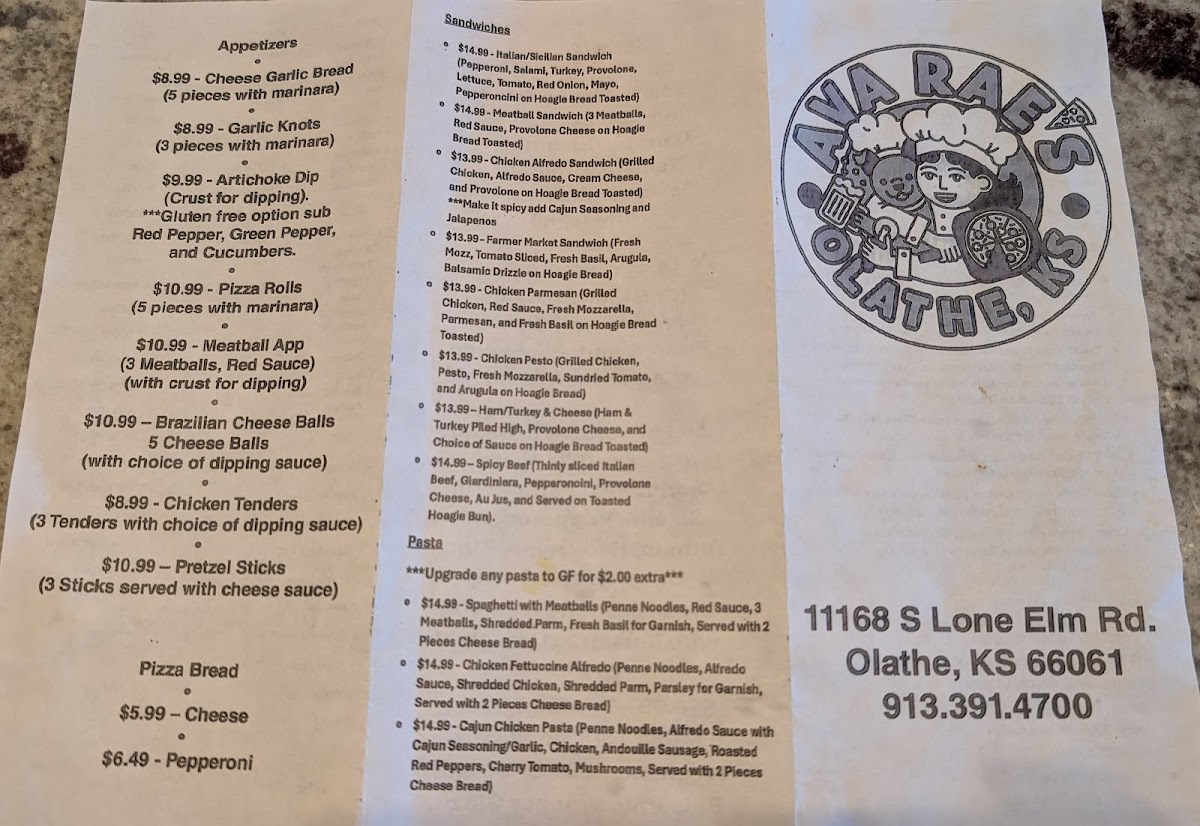 If you're looking for a place that serves up delicious pizza and a great atmosphere, Ava Rae's Pizzeria & Pub Menu has you covered. Nestled in Olathe, Kansas, this cozy spot on 11168 S Lone Elm Rd offers a wide variety of mouth-watering options. From perfectly crisp, cheesy pizzas with all your favorite toppings to hearty pub fare, every dish is crafted with care. Whether you’re in the mood for something light like a fresh salad or craving comfort food like a juicy burger, there’s something for everyone. The drink selection is just as impressive, with a range of craft beers and cocktails to pair perfectly with your meal. Whether you’re grabbing a quick bite or settling in for a relaxing meal with friends, Ava Rae’s promises a great time with food that hits the spot every time.