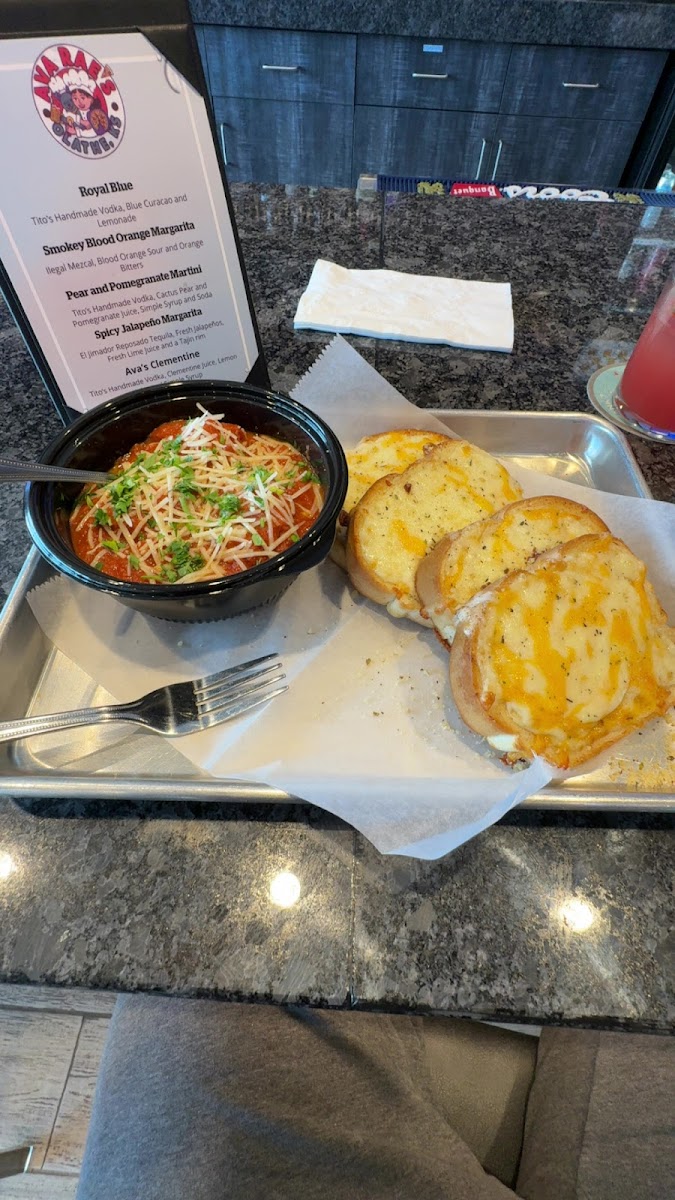 Penne noodles, red sauce, 3 meatballs, shredded Parm, and fresh basil for garnish, served with 2 pieces of cheese bread.